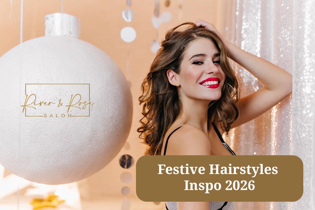 Festive holiday hairstyles in NJ! Long, short, updos & custom blonde/balayage. Book your River & Rose appointment today!